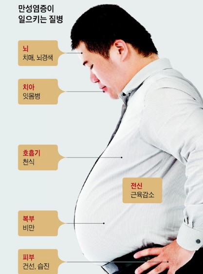 만성염증은 혈관을 타고 신체 곳곳을 돌아다니며 도착하는 곳의 신체 부위를 손상시키는 것으로 연구 돼 있고, 만성염증은 지방과 연관관계가 있어 지방이 있으면 만성염증 질환이 증가하는 것으로 알려져 있습니다.